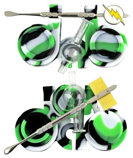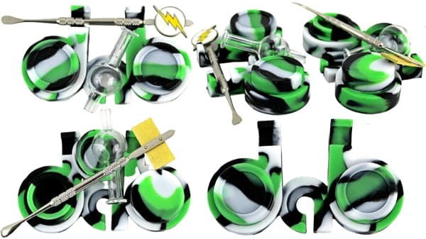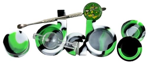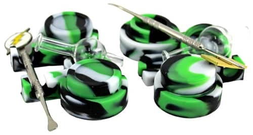 Dab Shape Silcone Stash Container with Dab Tool and Carb Cap Assortment. Colors/Designs May Vary. 10ct.