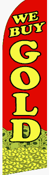15′ We Buy Gold Windless Business Bow Swooper Feather Flag Kit. Designed to dispay the full advertisement without any wind, although they fly with a rippling effect with the slightest breeze.