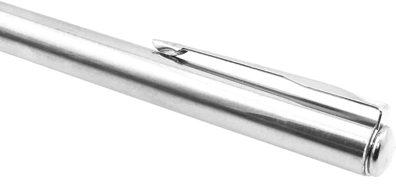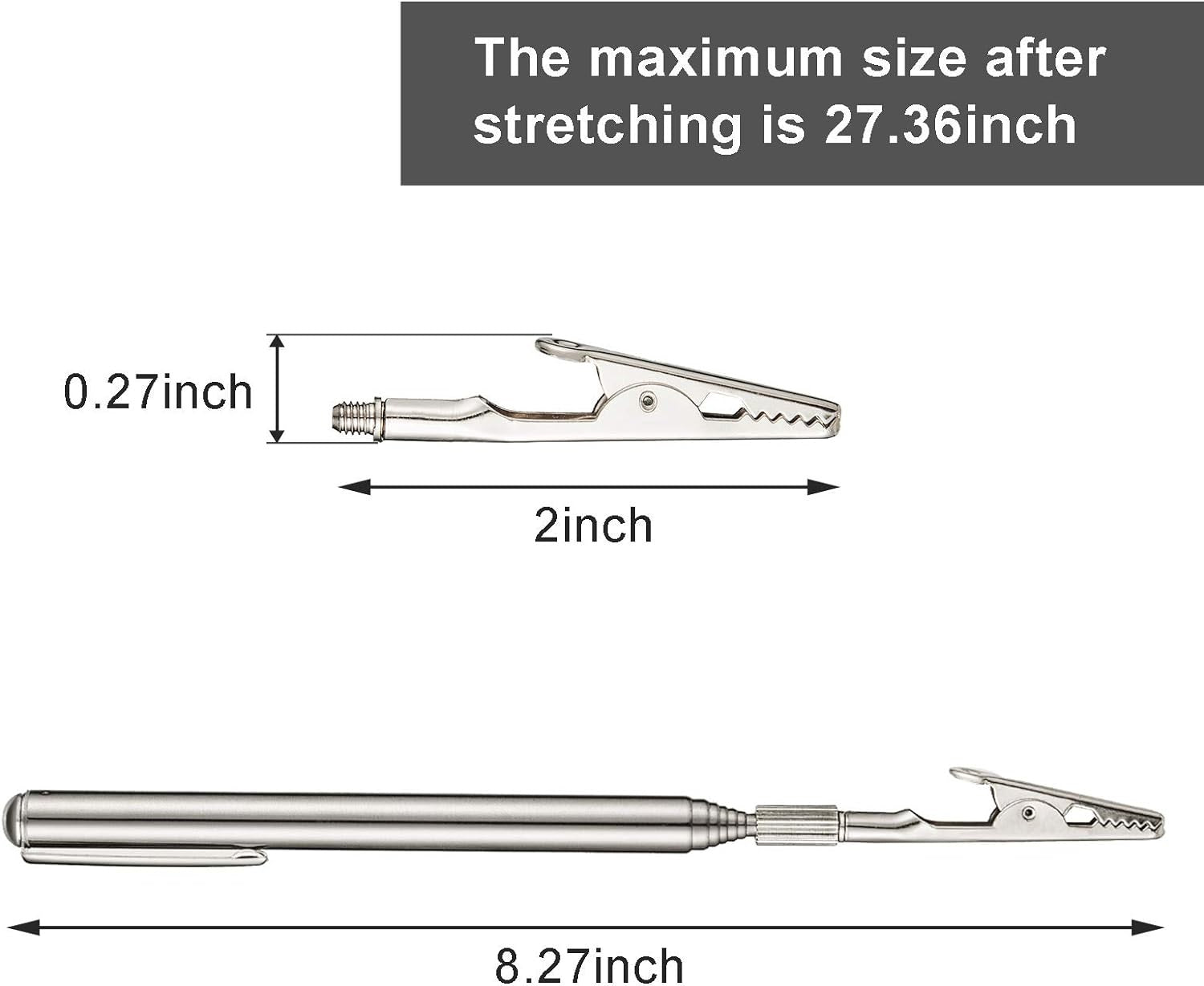 The Extendable Alligator Clip has a telescoping handle that allows it to get into tight and hard-to-reach places. Great for reaching pilot lights or making a temporary electrical connection. Use in crafts to paint model parts. Extends up to 35″! Has a metal pocket clip, easy to screw alligator neck, and a mouth that opens to a 1/2″.