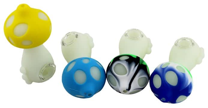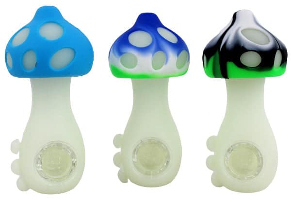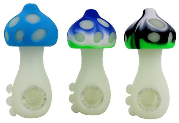 Mushroom Glow in the Dark Silicone Hand Pipe with Glass Bowl. Colors May Vary. 4.5″. 5ct.