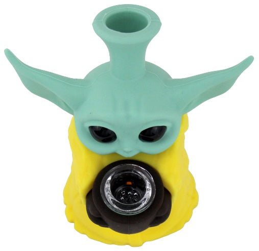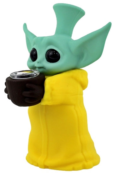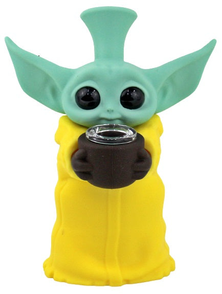 Silicone Bubbler Water Pipe – Baby Yoda Grogu Sipping Tea. Colors May Vary. 6″. 1ct.