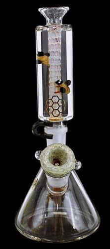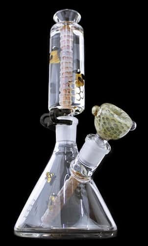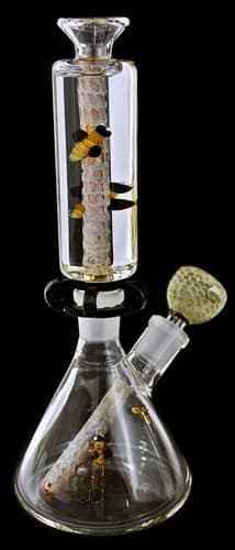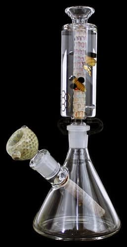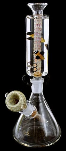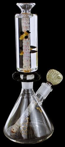 Liquid Filled Honeycomb Bee Art Beaker Water Pipe. 14mm Bowl Included. Colors May Vary. 9″. 1ct.