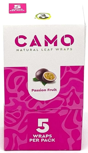 Afghan Hemp Camo Self-Rolling Natural Leaf Wraps – Passion Fruit. 25 Packs in a box display with 5 wraps per pack. 1ct.