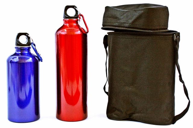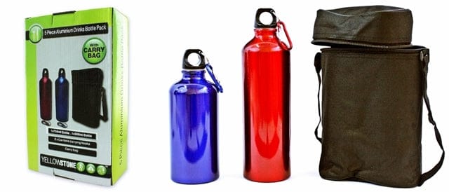 Aluminum Bottle Set With Carrying Bag. This set includes 2 aluminum bottles, 2 carabineer hooks and 1 carrying bag that fits both bottles. Ideal for road trips, hiking, sporting events and more. One bottle holes 750 milliliters and the other holes 500. Comes with a blue and red bottle. Carrying case is black. Everything is packaged into a sturdy box.
