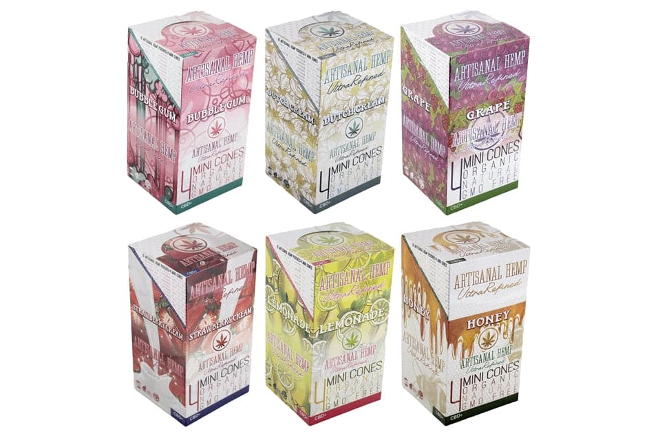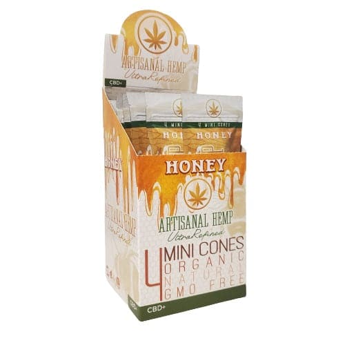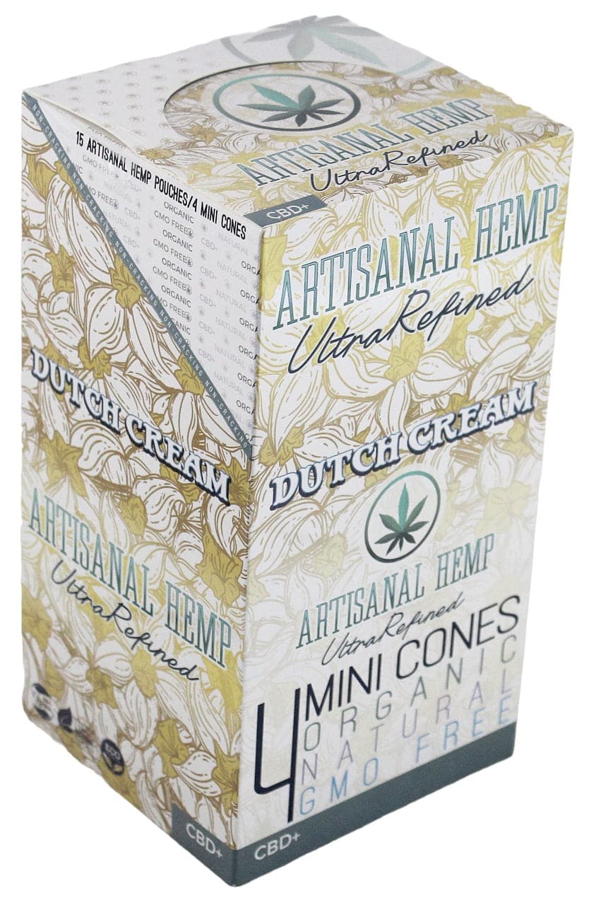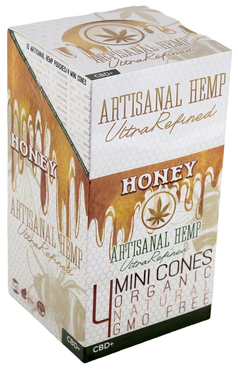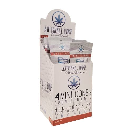 Artisanal Hemp Ultra Refined Mini Cones. 15 Packs in a box display with 4 cones per pack.