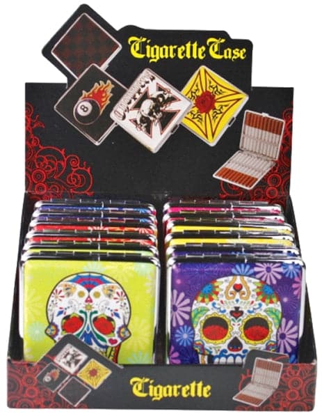 Cigarette Case with Double Clip. 80mm. Sugar Skull Style. 12 Cigarette Cases in Box Display.