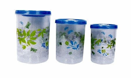 Decorative 3 Pack Storage Containers. These containers can be used for food items or for organizing closets, bathrooms and work spaces. Microwave and dishwasher safe, these decorative containers will work in a variety of decors. Three sizes: 9 1/2 cups, 6 cups and 4 cups.