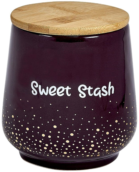 - Eggplant color with white words Sweet Stash and gold decorative dots