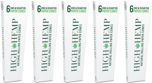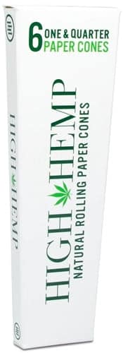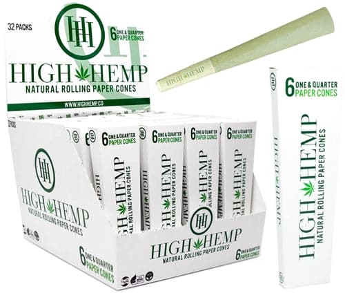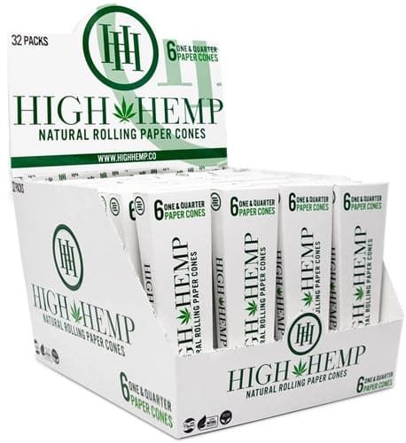 High Hemp 1 1/4 Natural Rolling Paper Cones. 32 Packs In A Box Display With 6 Cones Per Pack.
