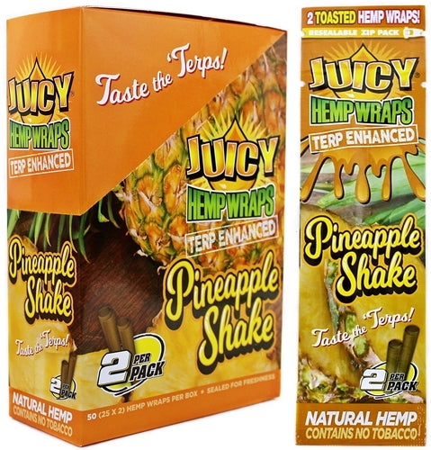 Juicy Hemp Wraps Terp Enhanced – Pineapple Shake. 25 Packs In A Box With 2 Blunt Wraps Per Pack.
