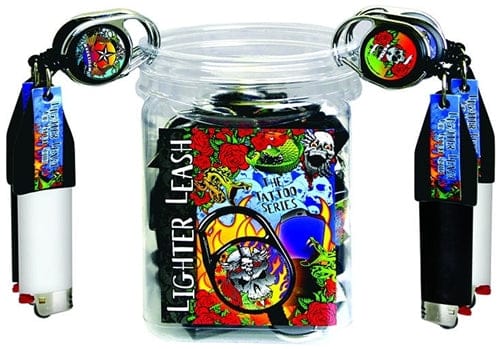 Lighter Leash Tattoo Series. Assorted Tattoo Designs. Stainless Steal Carabeiner Clip. Retractable Lighter Holder. 30 Leash In A Display Tub. Lighters Not Included.