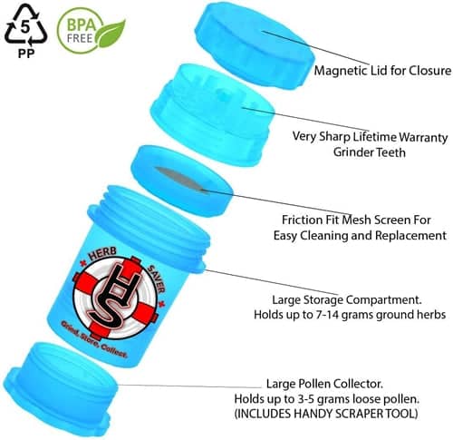 • Very Sharp Grinder Teeth. Friction Fit Pollen Screen for easy cleaning/replacement.