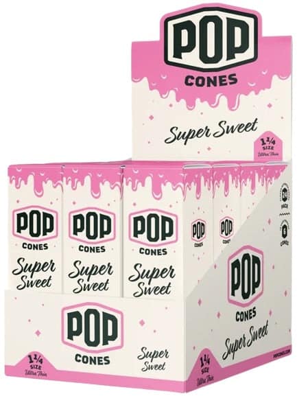 Pop Cones Flavor Activated Pre-Rolled Cones – 1 1/4 – ULTRA THIN – Super Sweet. 24 Packs in a box display with 6 cones per pack.