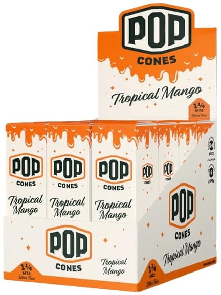 Pop Cones Flavor Activated Pre-Rolled Cones – 1 1/4 – ULTRA THIN – Tropical Mango. 24 Packs in a box display with 6 cones per pack.