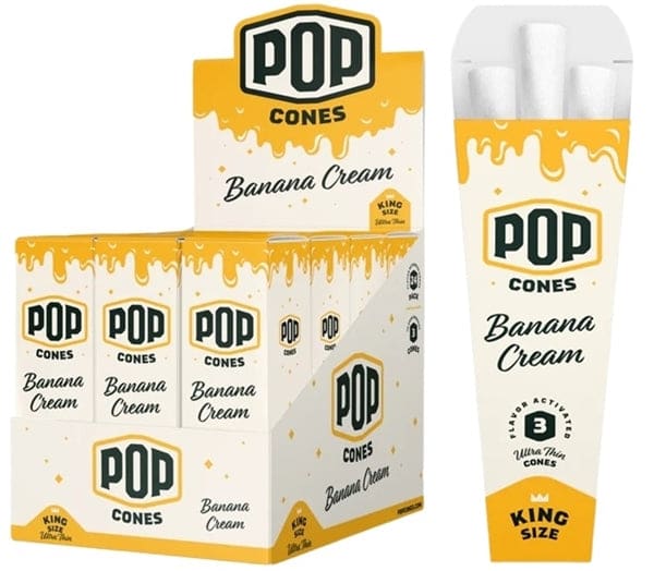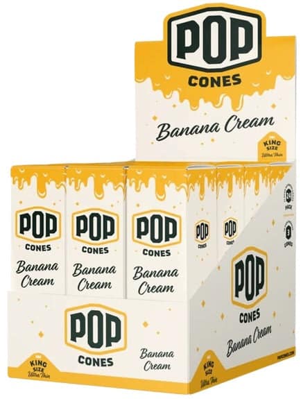 Pop Cones Flavor Activated Pre-Rolled Cones – King Size – ULTRA THIN – Banana Cream. 24 Packs in a box display with 3 cones per pack.