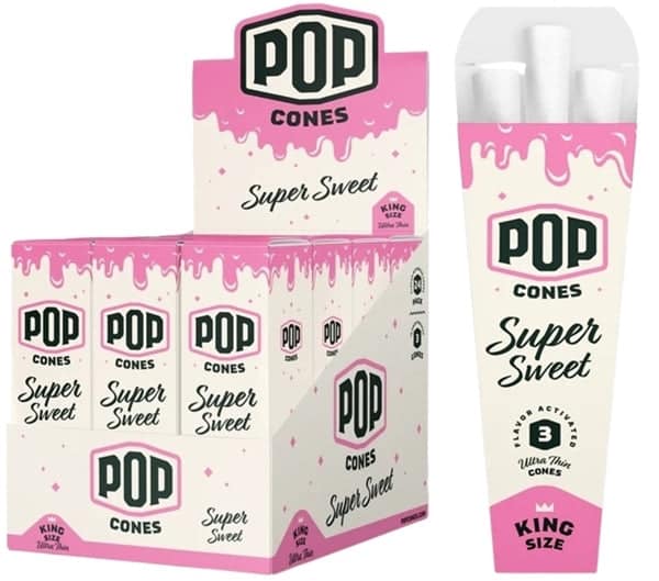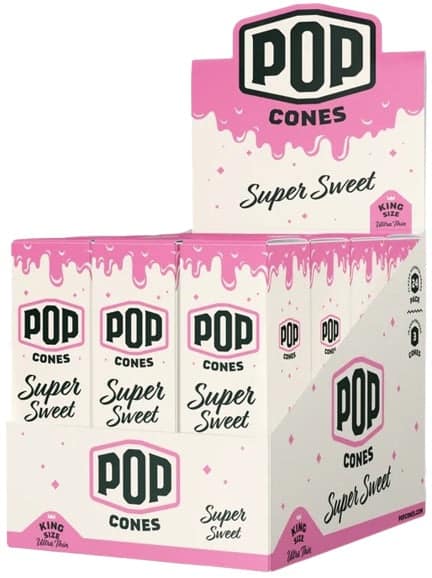 Pop Cones Flavor Activated Pre-Rolled Cones – King Size – ULTRA THIN – Super Sweet. 24 Packs in a box display with 3 cones per pack.