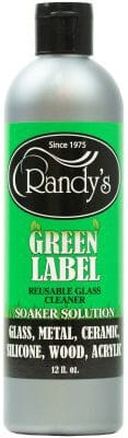 This earth friendly glass cleaner is simple to use. Just fill the glass item to be cleaned and make sure you block any orifices to prevent leaking or put the glass piece in a container and cover with the solution. Let the item soak until clean. No more shaking or swirling. Rinse the item thoroughly in warm water after soaking. To reuse the solution just filter out the solid particles and re-bottle the cleaner. Discard it when it is no longer effective. Randy’s Green Label is THE environmentally friendly and biodegradable glass cleaner of choice.