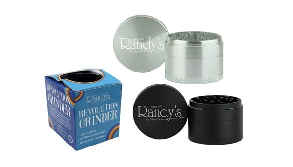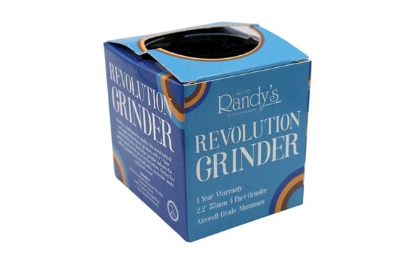 Randy’s Revolution Grinder is a 4 part grinder made of premium aircraft grade aluminum that includes a storage bag, premium scoop.