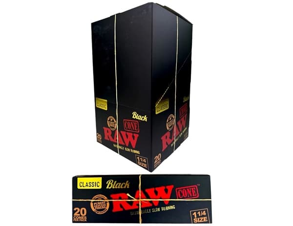 Raw Black Cones 1 1/4 Size. 12 Packs in a Box Display with 20 Cones Per Pack.