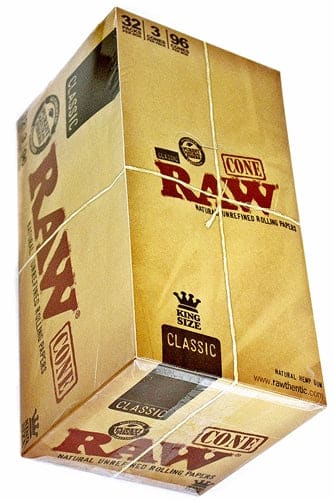 Raw Kingsize Unbleached Cones. Box contains 32 packs with three cones each.