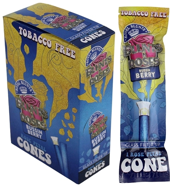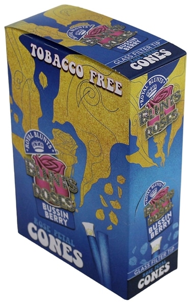 Royal Blunts N Roses – Rose Petal Cones with Glass Tips – Bussin Berry. 10 Packs in a Box Display with 1 Rose Petal and 1 Glass Filter Tip Per Pack.
