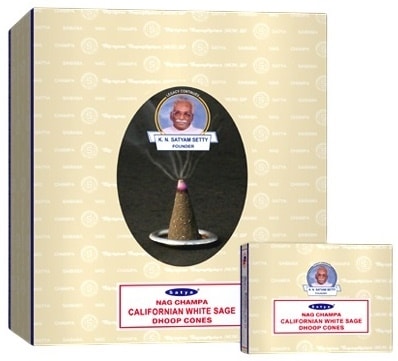 Satya Incense Dhoop Cones – California White Sage. 12 Packs In A Box Display with 12 Cones and Stand Per Pack.