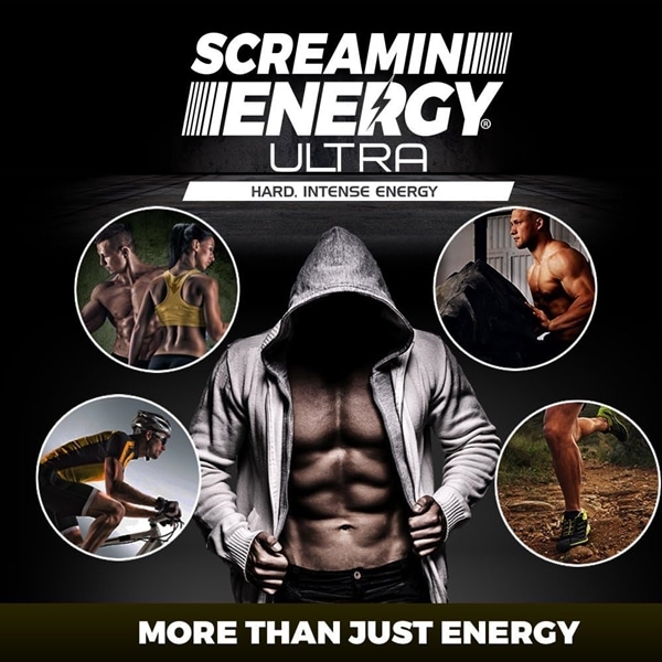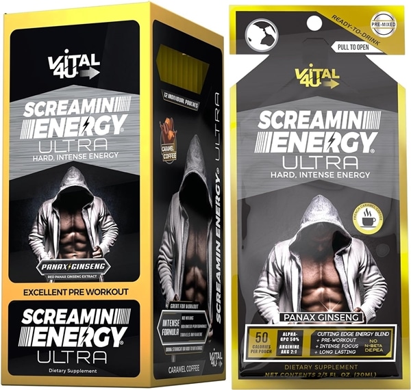 Screamin Energy Ultra, Pre-workout Energy Shot with Caffeine, L-Arginine AKG, Alpha GPC, and Ginseng, French Roast Caramel Coffee Flavor. 12 Packs in a Box Display.