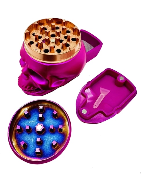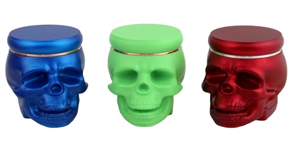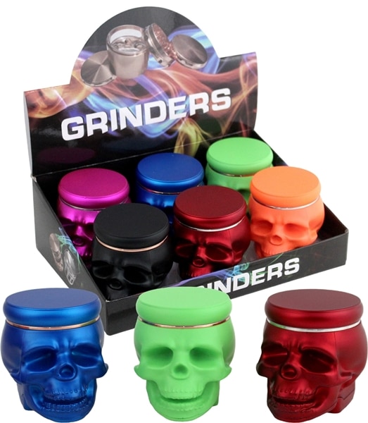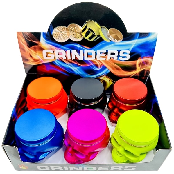 Skulls 4pc Premium Novelty Grinders. Push Open Drawer. Magnetic Base. 2.2″ x 3″. 6 Grinders in a Box Display.