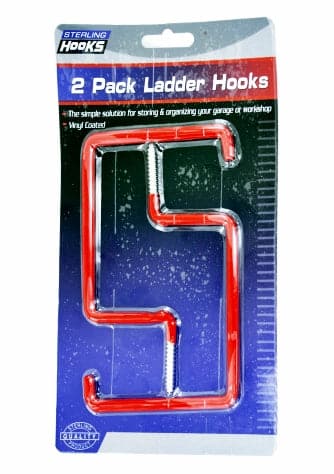 Sterling 2 Pack Ladder Hooks. Ladder hooks are the simple solution for storing and organizing garages, workshops and more! Hooks are made with sturdy metal and are vinyl coated making them long lasting. No need for hardware. Hooks have screw ends making them easy to install. Each set comes with 2 ladder hooks. Hooks measure 6 1/4″ long, 4″ wide and screw area is 1 1/4″.