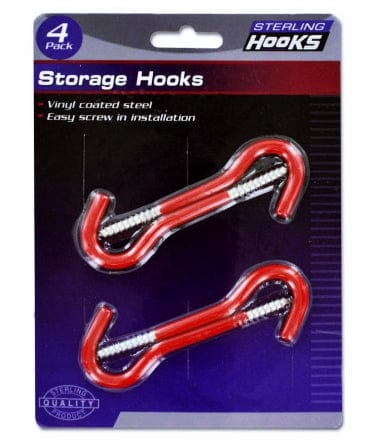 Sterling Storage Hooks. No need for hardware – storage hooks conveniently screw directly into walls and ceilings! Hooks are steel with a vinyl coating that will not scratch bikes or other painted items. Hooks are ideal for garages and storage spaces. Hooks measure 3 3/4″ with the screw portion measuring 3/4″.