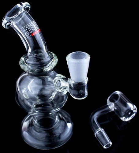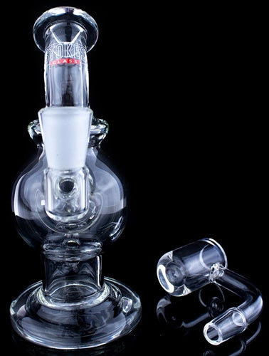 the go or at home! It features a 10mm female joint with quartz banger. Featuring a spherical hollow “ball” shape, fixed feed-through stem as well as a thick base and construction. This rig design allows for you to get a perfect flavorful dab!