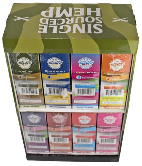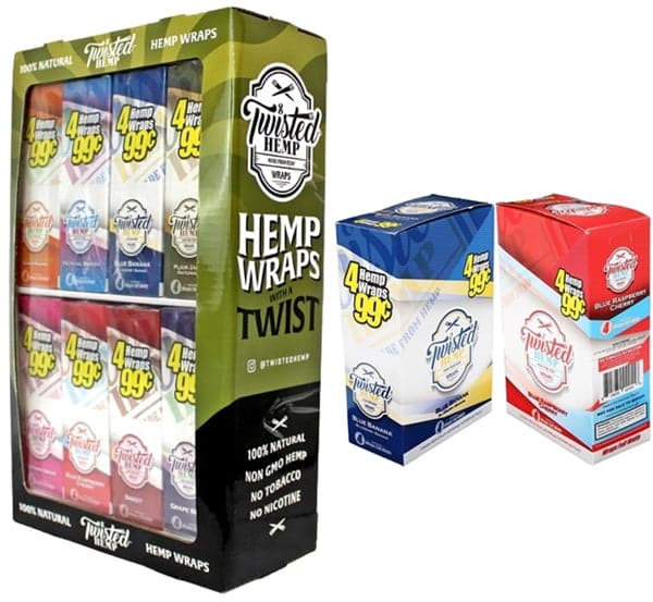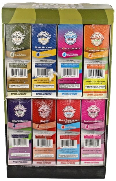 Twisted Hemp Wraps 8 Flavor Combo with Display. 8 Flavors with 15 Pouches In A Box and 4 Wraps Per Pouch.