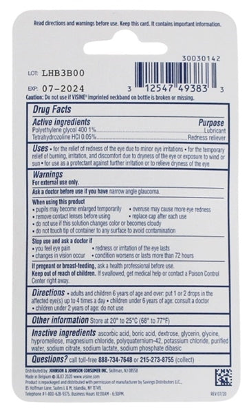 - Tetrahydrozoline HCI 0.05% (Redness reliever)