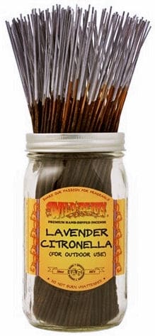 100 hand-dipped Lavender Citronella Incense Sticks. For outdoor use. An intense citronella blend balanced with notes of lavender. Chases bugs away. Jar Not Included.