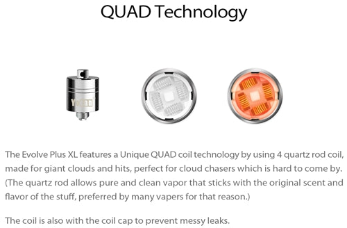 The Evolve Plus XL features a Unique QUAD coil technology by using 4 quartz rod coil,made from giant clouds and hits,perfect for cloud chasers which is hard to come by.The coil is also with the coil cap to prevent messy leaks.