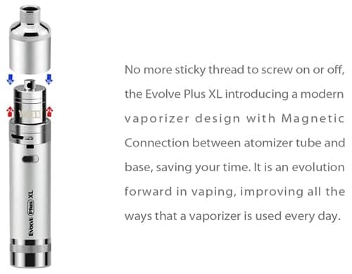 No more sticky thread to screw on or off,the Evolve Plus XL introducing a modern vaporizer design with Magnetic Connection between atomizer tube and base,saving your time.It is an evolution forward in vaping,improving all the ways that a vaporizer is used every day.